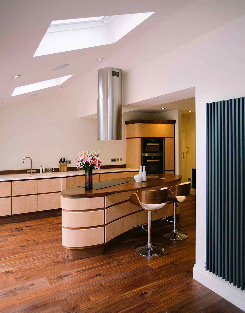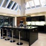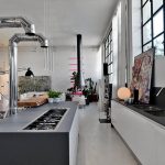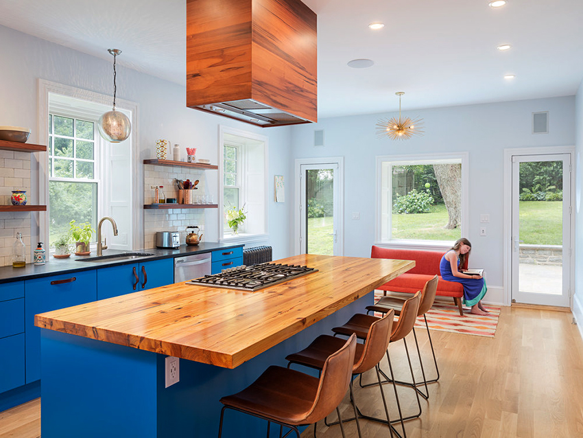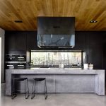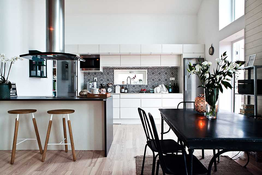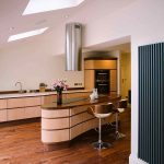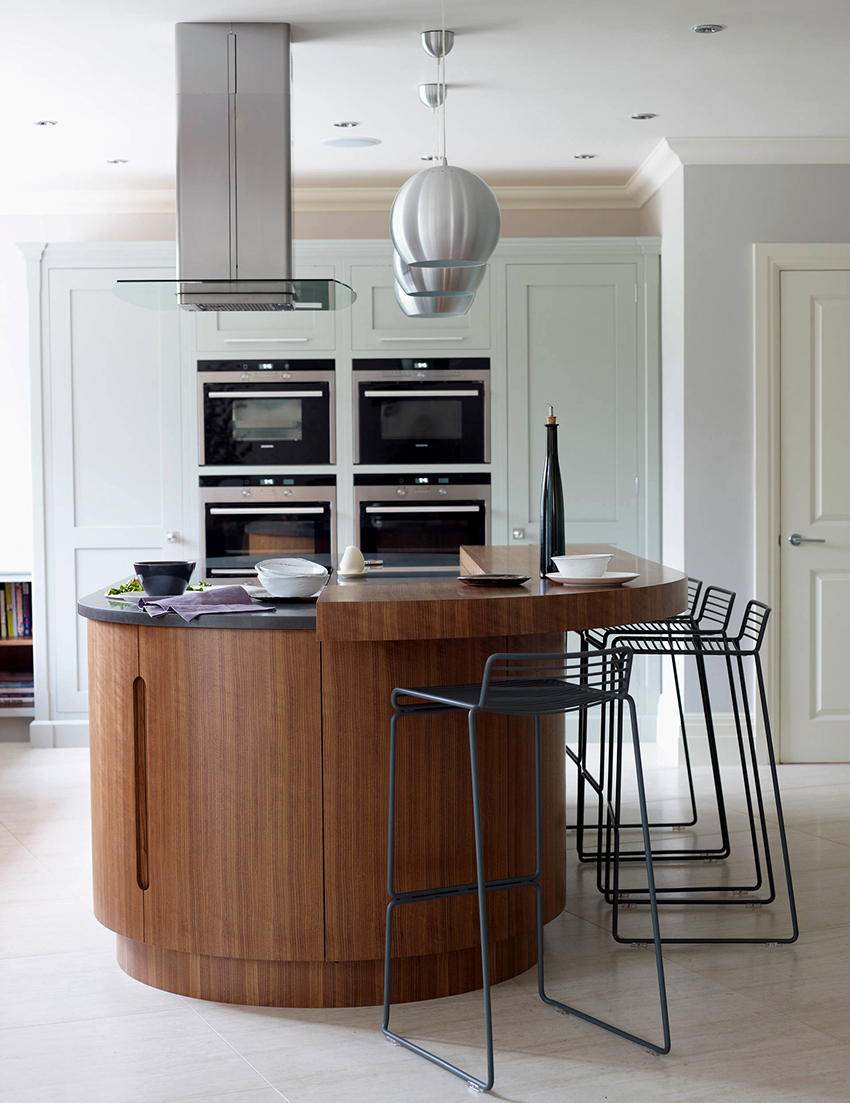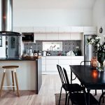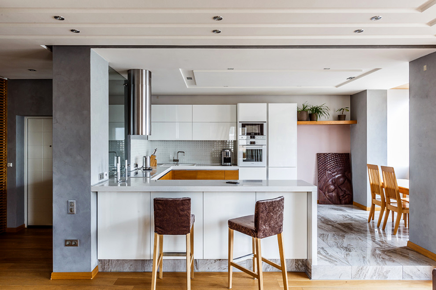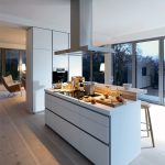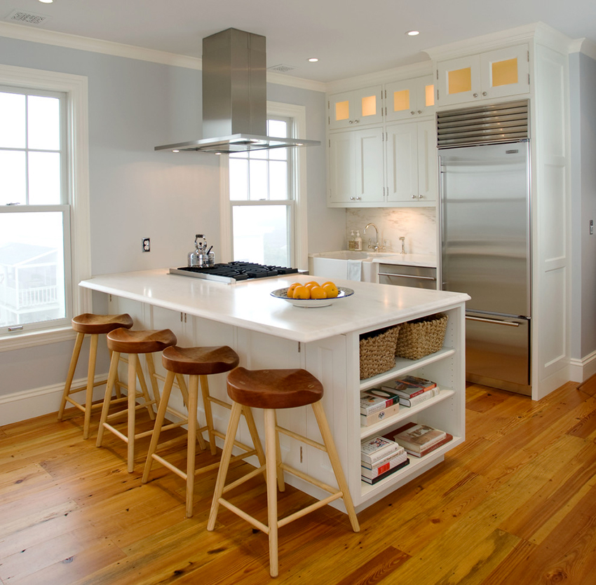 Perlu memberi keutamaan kepada tudung silinder. Bersama dengan sudut bulat meja (ini adalah pilihan), mereka akan membuat komposisi yang sangat baik dan ruang kerja yang selesa di dapur pulau kecil. Tudung berwarna putih atau cahaya yang lain mampu meningkatkan ketinggian bilik secara visual.