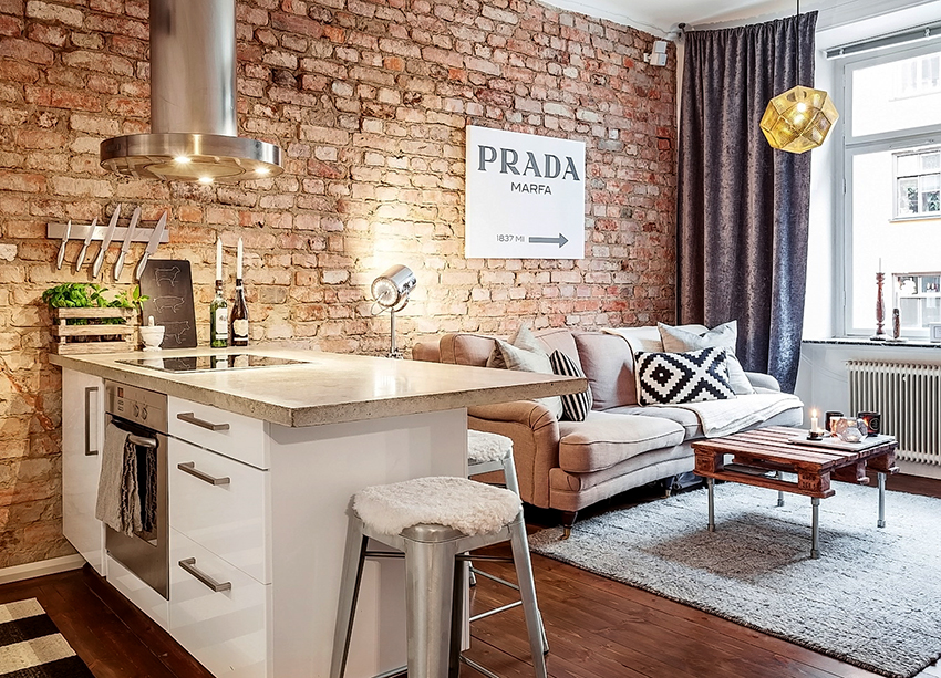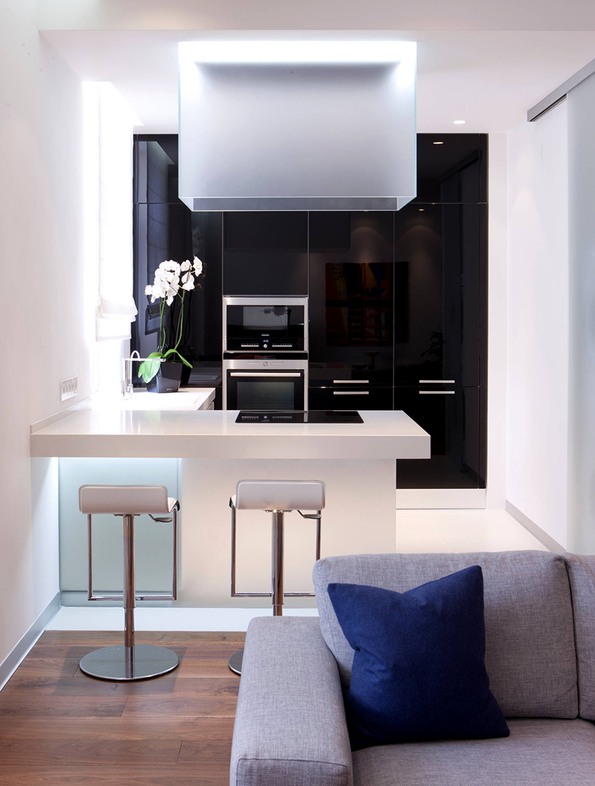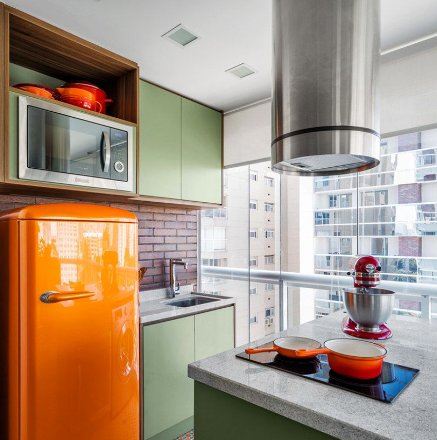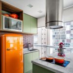 Kawasan dapur kecil bukan ayat. Anda tidak boleh melepaskan inovasi dalaman dan fungsional, anda hanya perlu membuang ruang yang ada. Terdapat juga tudung pulau kecil untuk bilik miniatur. Model domestik disyorkan untuk dielakkan. Mereka kelihatan besar di ruang kecil.