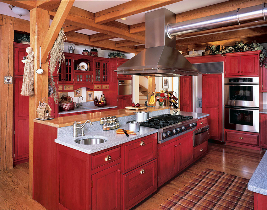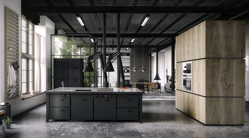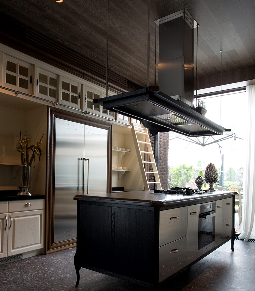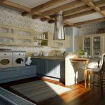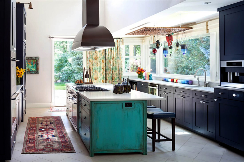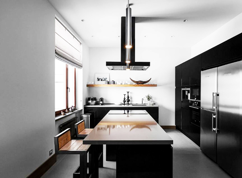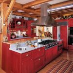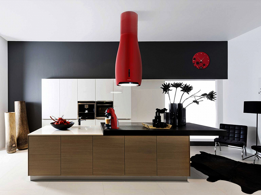 Reka bentuk perabot dapur lebih jelas dinyatakan dalam gaya hiasan tertentu, tudung pengekstrak memainkan peranan yang semakin ketara di kawasan pedalaman. Sebelumnya dibangun ke dalam bahagian struktur perabot, ia telah menjadi elemen bebas, ukurannya bertambah dan memperoleh berbagai bentuk.