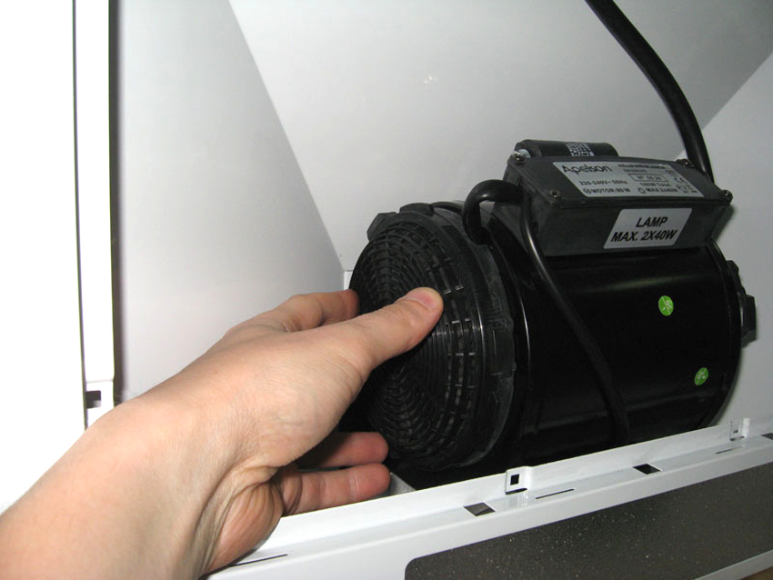 Pengoperasian penapis arang dipastikan dengan menghidupkan kipas, yang menyalurkan aliran udara ke tudung
