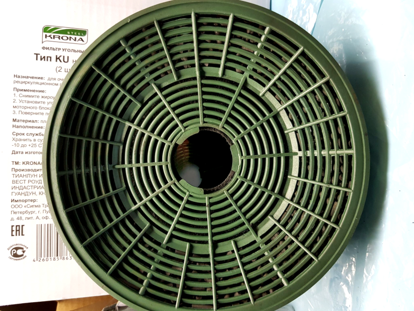 Dalam kartrij penapis karbon, bahan aktifnya adalah butiran kecil karbon aktif atau serbuk karbon, ciri utamanya ialah keupayaan untuk menyerap dan mengekalkan pelbagai kekotoran yang terkandung di udara yang ditarik. Dengan penggunaan aktif, penapis pada tudung disyorkan untuk diganti sekurang-kurangnya sekali setiap 4 bulan. Elemen pembersih dipasang tepat di belakang gris mesh, yang melindunginya dari masuknya zarah-zarah berlemak besar yang dapat mengganggu operasi penyerap karbon.