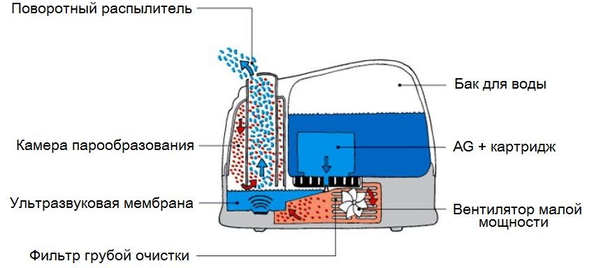 Nota! Proses menukar cecair menjadi kabus di dalam pelembap udara adalah seperti berikut: gelombang ultrasonik, kerana getaran mekanikal, memaksa membran yang dibasahi dengan air untuk bergerak. Mereka tidak memberi kesan kepada manusia.