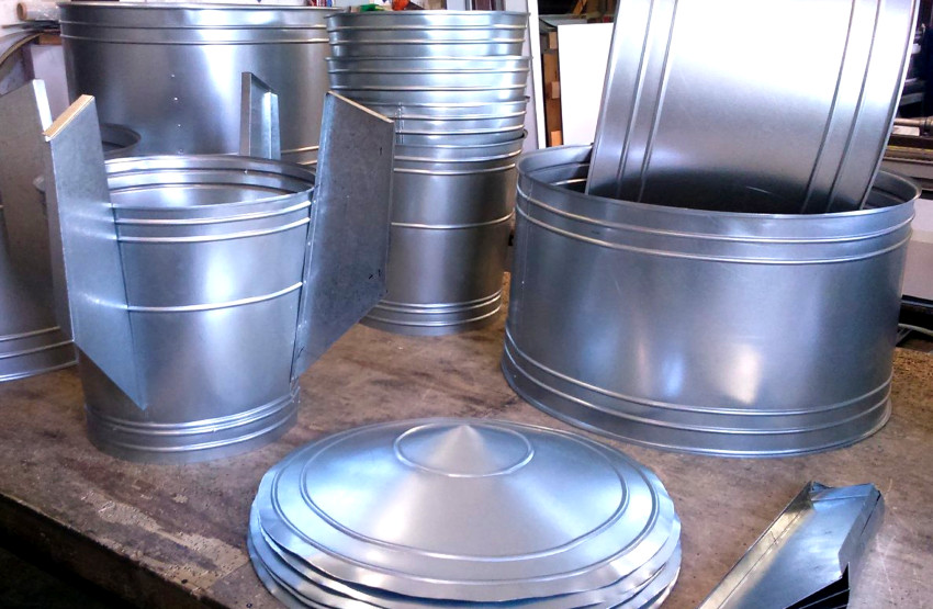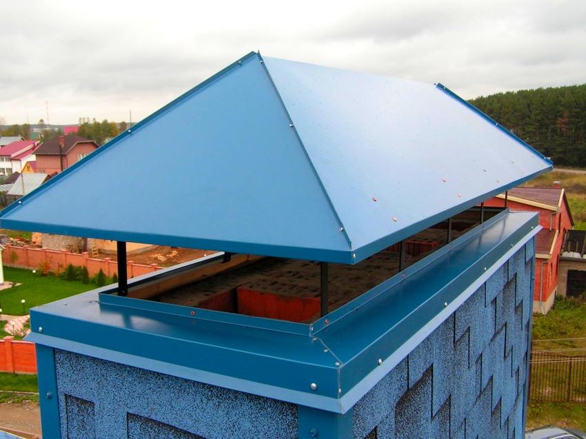 Oleh itu, setelah bahagian-bahagian yang diperlukan dipotong dari kepingan timah, ia disambungkan satu sama lain dengan menggunakan keling. Kemudian deflektor siap diletakkan di kepala, dan paip cawangan bawah ditarik bersama dengan penjepit. Sekiranya batangnya berbentuk segi empat sama, penyesuai juga dibuat atau dibeli, bebibirnya dipasang pada hujung paip.