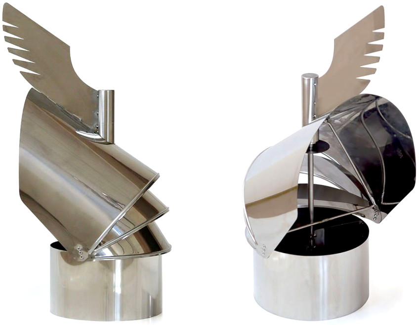 Reka bentuk dapat digabungkan dengan selamat menjadi satu kumpulan, kerana mereka tidak hanya serupa antara satu sama lain, tetapi juga mempunyai prinsip operasi yang serupa. Sekiranya kita mempertimbangkan lukisan deflektor turbo, anda boleh memperhatikan fakta bahawa ciri khas peranti adalah bentuk bulat alat putar dengan bilah dalam bentuk separuh bulatan, yang berputar di bawah pengaruh kekuatan angin. Dalam kes ini, udara yang jarang ditemui, yang meningkatkan kecekapan tudung, terbentuk di dalam sfera di atas kepala paip.