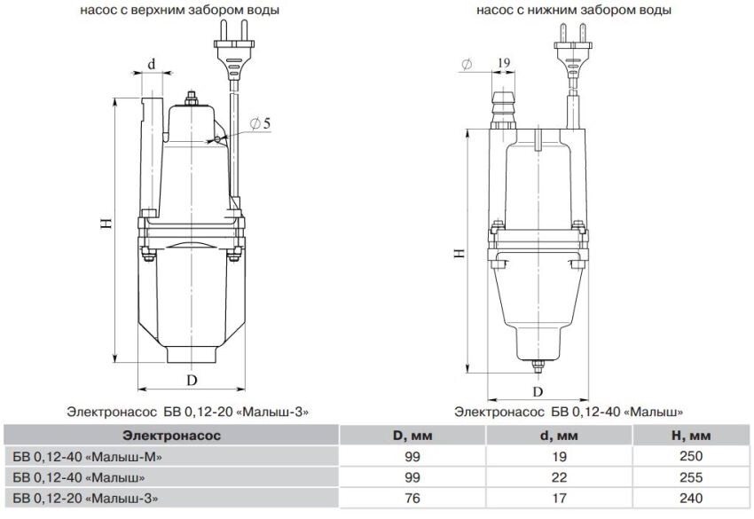Model asasnya tidak dilengkapi dengan perlindungan overheating, filter dan pressure switch. Dan jika penapis masih boleh dipasang sendiri, maka anda perlu melakukan tanpa pengubahsuaian lain. Sudah tentu, semua ini secara langsung mempengaruhi harga unit, kerana jauh lebih rendah daripada model lain. Model dasar dapat merendam maksimum 5 m, dan air ditarik melalui injap bawah.