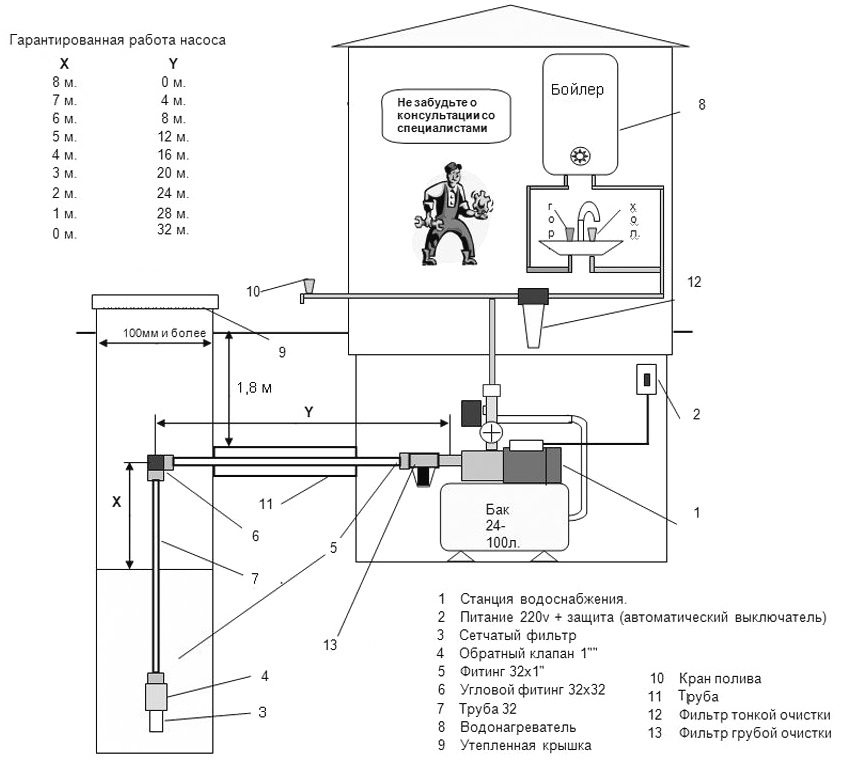Nasihat berguna! Sekiranya hasil pengiraan melebihi 8 meter, unit harus dipindahkan lebih dekat ke sumbernya. Pemasangan di lubang dibenarkan. Sangat penting untuk melindunginya dari kelembapan dan sejuk. Penyelesaian lain yang mungkin adalah dengan memasang pam tenggelam.