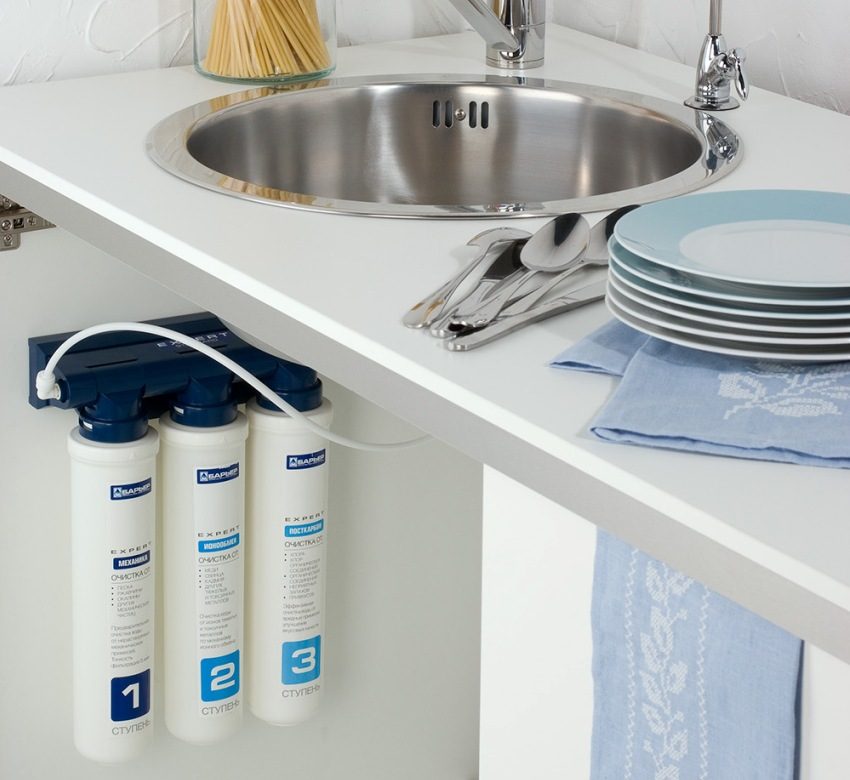Cara lain yang mudah untuk memastikan ketersediaan air bersih adalah memasang penapis sink... Jadi, air akan menjalani penyucian sebelum anda pergi ke pengadun. Lebih-lebih lagi, terdapat penapis satu peringkat dan pelbagai peringkat.