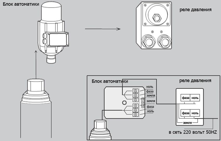 Sebelum menyambungkan kabel, lepaskan penutup plastik pelindung dari peranti. Kabel elektrik saluran bekalan atau pam dibawa ke soket yang sesuai. Di luar, wayar dipasang dengan mur dengan cincin plastik kelim. Penunjukan kumpulan kontak ditunjukkan pada badan. Hujung kabel terbahagi kepada teras. Fasa, neutral, pembumian dilucutkan dari jalinan penebat dan disambungkan ke terminal kumpulan kenalan.