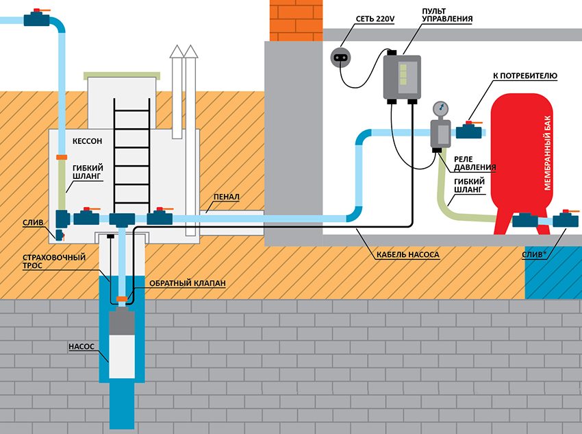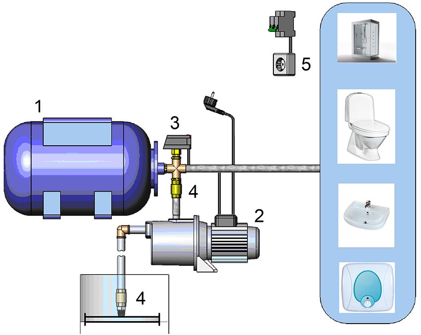 Struktur bekalan air terdiri daripada: 1 - hidroakumulator; 2 - pam; 3 - suis tekanan; 4 injap periksa; 5 - bekalan kuasa