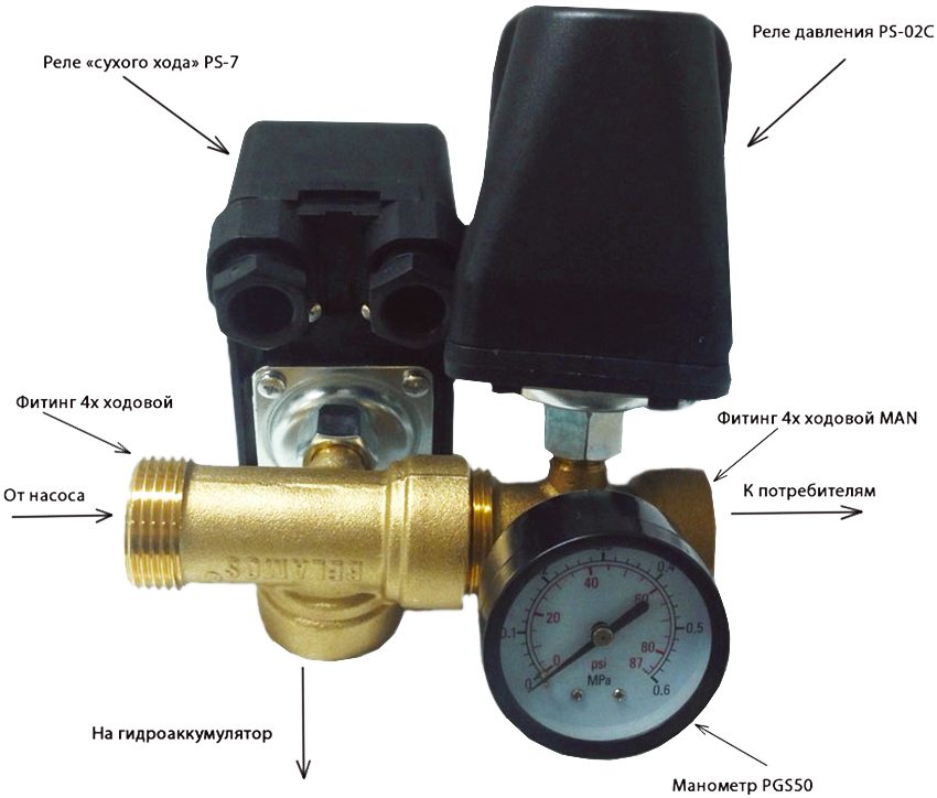 Unit kawalan pam kelihatan seperti kotak plastik kecil. Peranti dipasang di pintu masuk ke tangki simpanan. Suis tekanan untuk penumpuk terdiri daripada bahagian mekanikal dan elektrik.