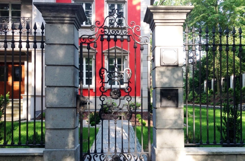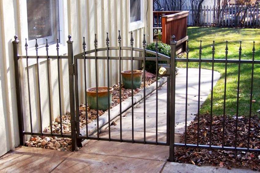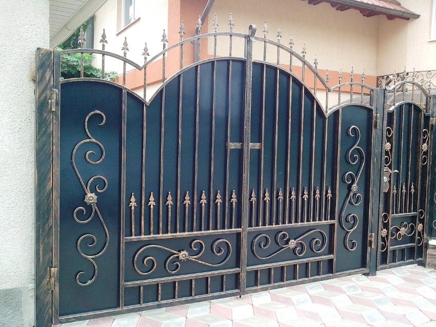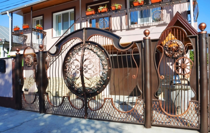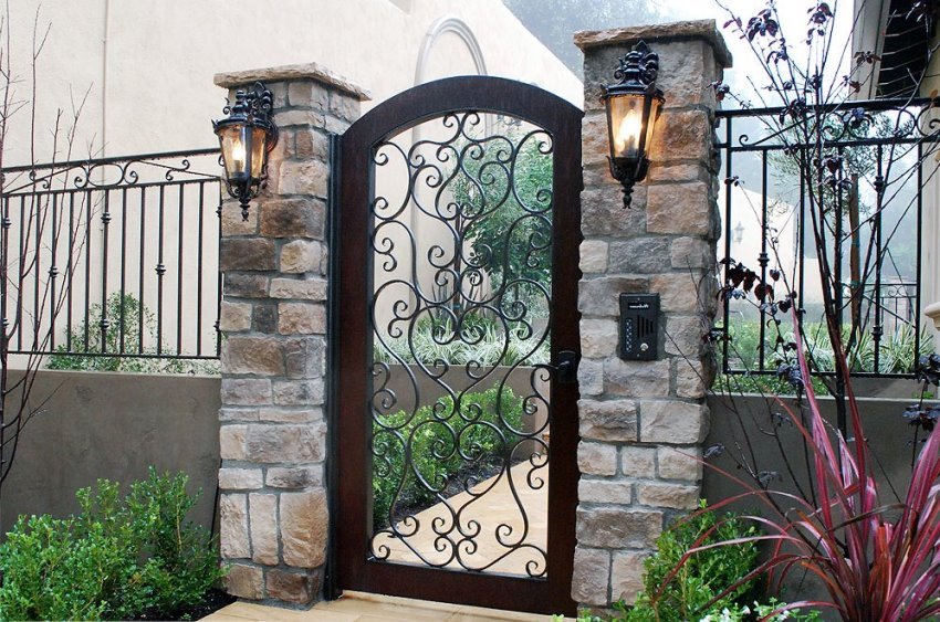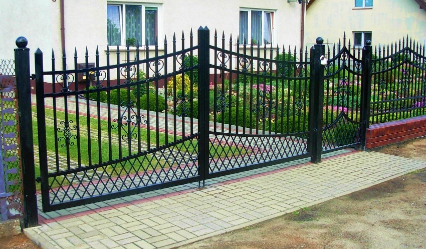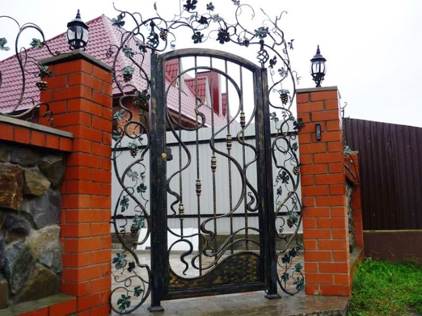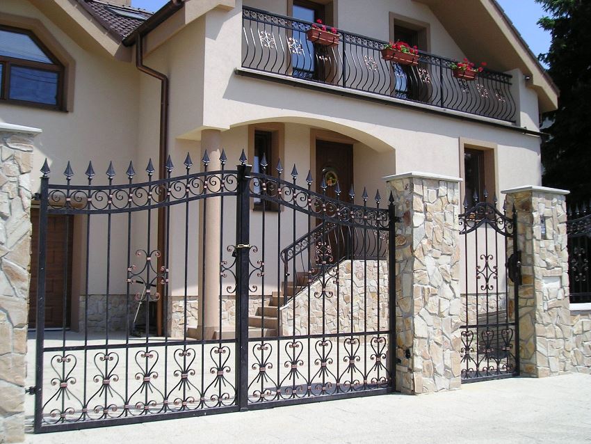 Pintu besi tempa boleh digabungkan dengan pagar yang diperbuat daripada bahan apa pun