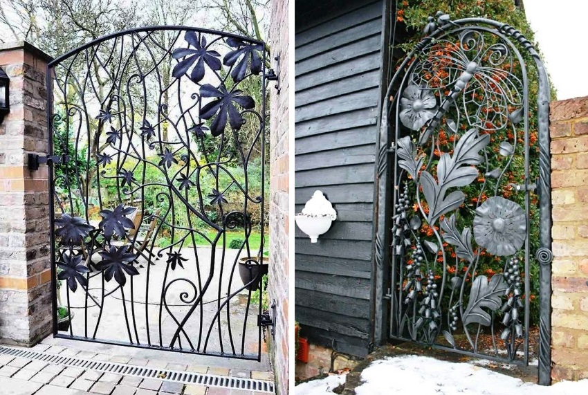 Produk-produk ini dibuat dalam pelbagai gaya dan boleh merangkumi bukan hanya corak tradisional, tetapi juga hiasan yang kompleks. Pintu gerbang yang ditempa dengan gerbang terbina dalam dapat dihiasi dengan gaya yang sama atau bertindak lebih asli dan membuat jalan yang berbeza dan menarik dalam kanvas pembinaan.