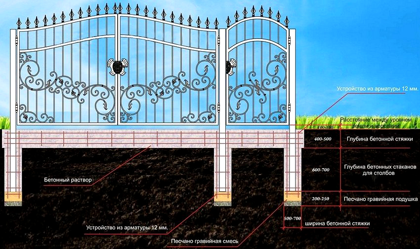 Oleh kerana gerbang yang ditempa mempunyai jisim yang besar, penyokong di bawahnya mesti kuat dan boleh dipercayai. Pilihan terbaik dalam kes ini adalah menyusun tiang yang kuat dengan bata. Setiap sokongan mesti mempunyai pangkalan, diwakili oleh bar yang memberikan kestabilan yang diperlukan.