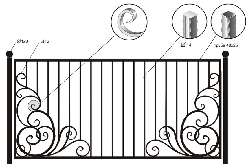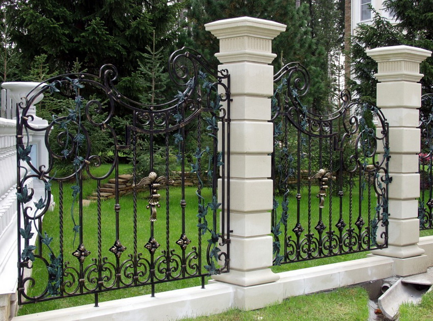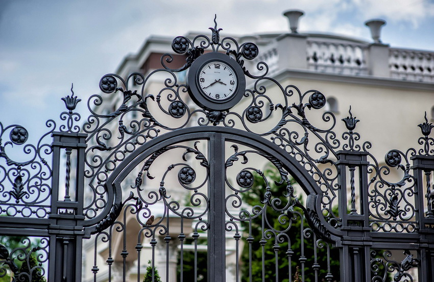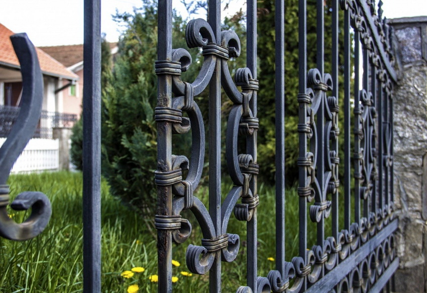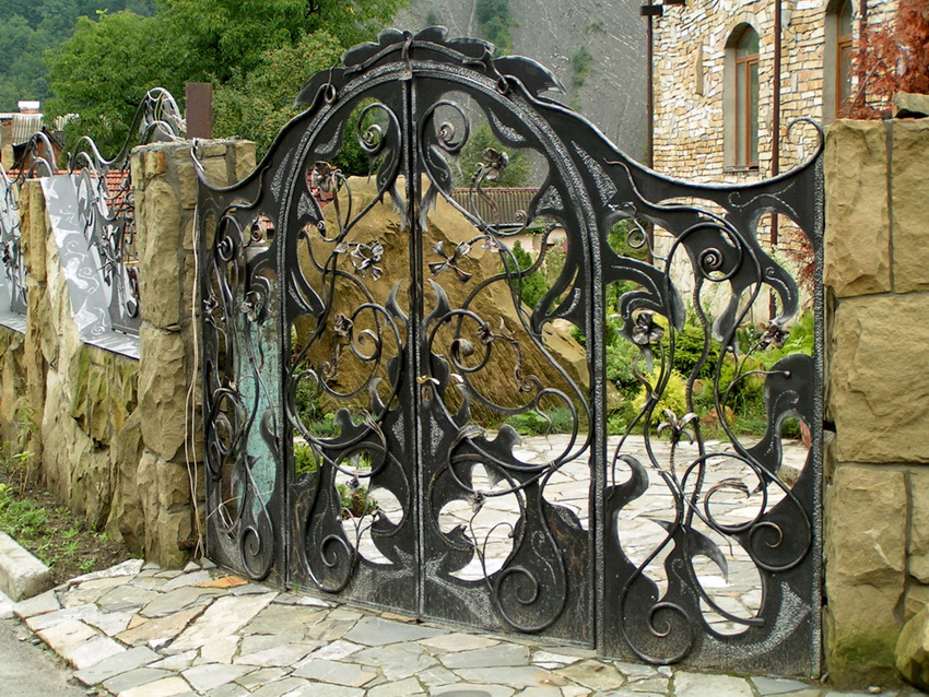 Diperlukan untuk memilih terlebih dahulu gerbang yang sesuai untuk pagar besi tempa. Mereka boleh terdiri dari pelbagai jenis, tetapi yang paling popular adalah swing and sliding sash.Semasa memasang pagar, perlu diingat bahawa ia tidak boleh terletak berdekatan dengan jalan raya. Jarak minimum dalam kes ini ialah 1.5 m.