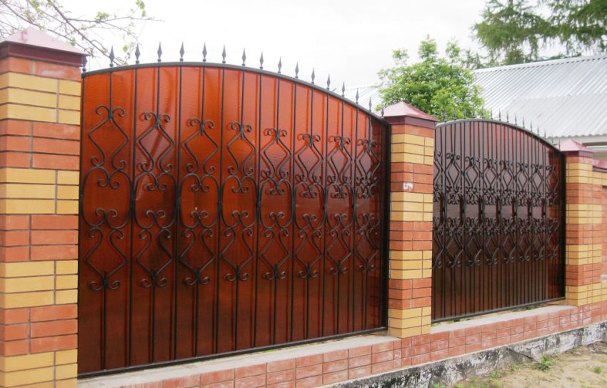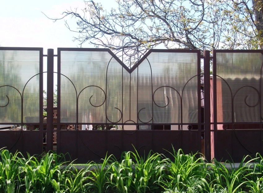 Kelebihan lain dari bahan binaan ini adalah pelbagai warna. Sekiranya perlu, anda boleh memilih warna yang paling sesuai untuk digabungkan dengan bingkai logam atau bata. Gabungan PCB dengan pagar besi tempa... Penempaan dengan polikarbonat memerlukan pengeluaran dana yang cukup besar, tetapi bukan hanya menyenangkan mata, tetapi juga struktur yang sangat tahan lama.