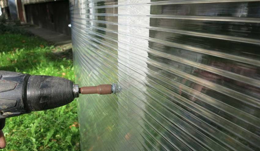 Seterusnya, kepingan dilekatkan pada bingkai.Ini adalah langkah utama dalam membina pagar. Fiksasi dilakukan dengan menggunakan skru mengetuk sendiri. Penting untuk diingat bahawa polikarbonat boleh retak semasa pemasangan pada bingkai. Untuk mengelakkan ini, para pakar mengesyorkan membuat semua lubang terlebih dahulu.