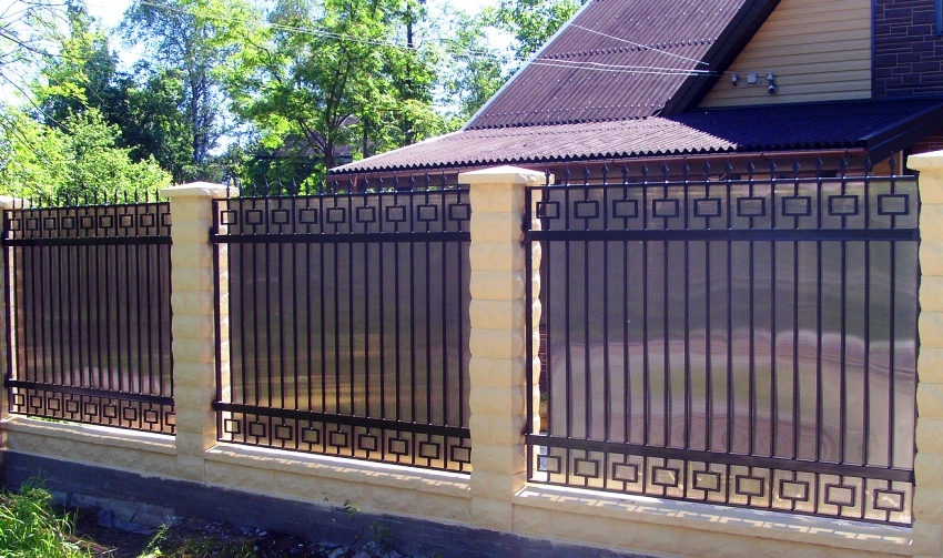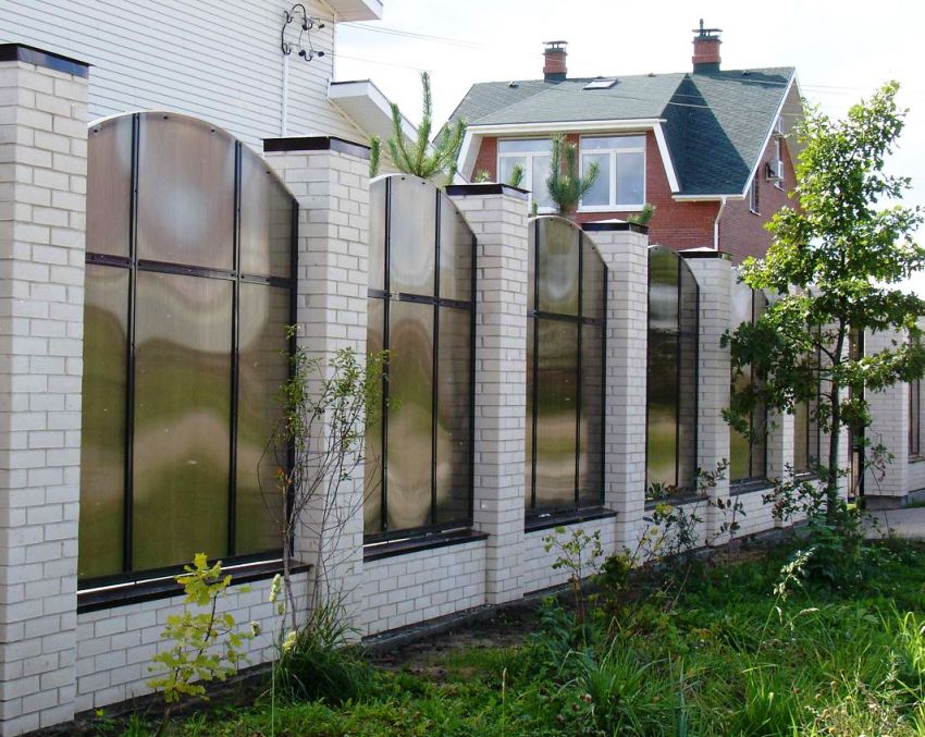 Dan juga kombinasi lain adalah mungkin, yang kurang biasa, tetapi juga popular. Ia adalah pagar lembaran polikarbonat. Pagar seperti itu lebih sukar dilakukan dengan tangan anda sendiri.