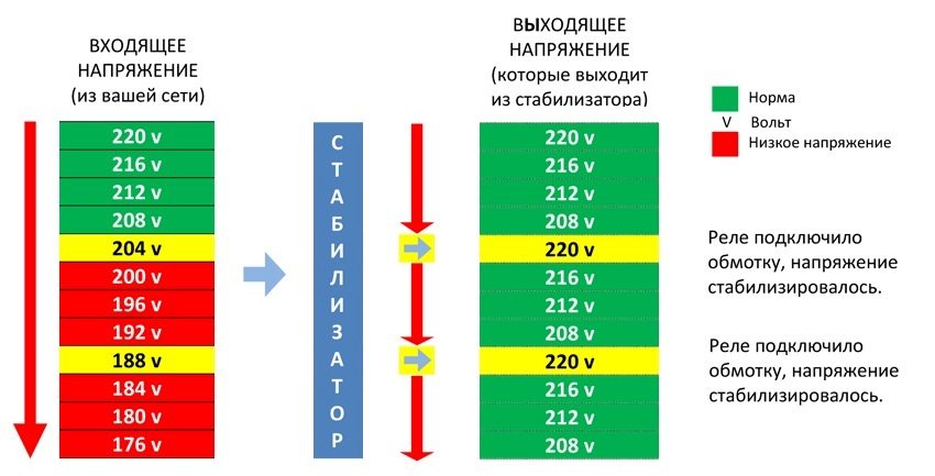 Nyttige råd! Når du kjøper en stabilisator, bør du ta hensyn til at enhetens nominelle effekt vil være mye lavere hvis inngangsspenningen er under 220V. Store spenningssvingninger kan redusere kraften til enheten i to.