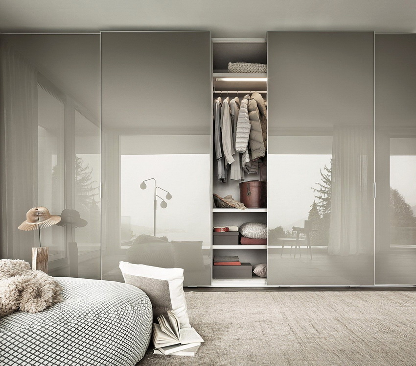 En skyvegarderobe med speil på soverommet er ikke bare en multifunksjonell design, men også et nødvendig element av rominnredning. Ved å bestille speilvendte dører kan du ikke bare spare plass (i tilfelle et frittstående element), men også visuelt øke rommet. Speilet kan være gjennomsiktig, matt, bronse, tonet og grafitt. Denne gjennomsiktige innglassingen vil gi strukturen et stilig utseende, vil tillate deg å raskt finne det nødvendige og lære eieren å bestille.
