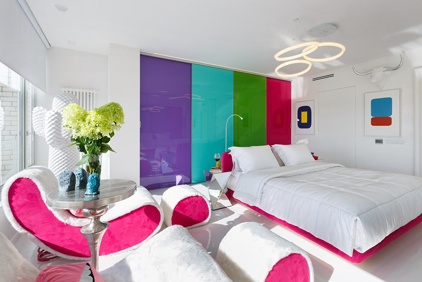 For å skape en stilig aksent i rommet, er det verdt å velge en modell med lyse mettede flekker. Det viktigste her er ikke å overdrive det, fordi soverommet er et spesielt sted for avslapning og avslapning.Derfor bør du ikke velge modeller med aggressive farger, som rød eller oransje, som vil bli en irriterende faktor for nervesystemet. Men når du velger skreddersydde barnemøbler til soverommet, kan garderoben lages i lyse farger, noe som vil gi rommet livlighet og lekenhet, noe som gjør det interessant for barnet.
