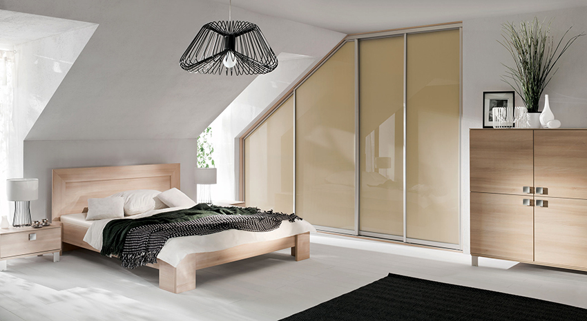 Skyvegarderober har forskjellige former, de er installert på et hvilket som helst, til og med trangt, stort sted. En slik modell kan plasseres i en nisje, langs en av veggene eller i hjørnet, som tydelig vises på bildet av de innebygde garderobene på soverommet.