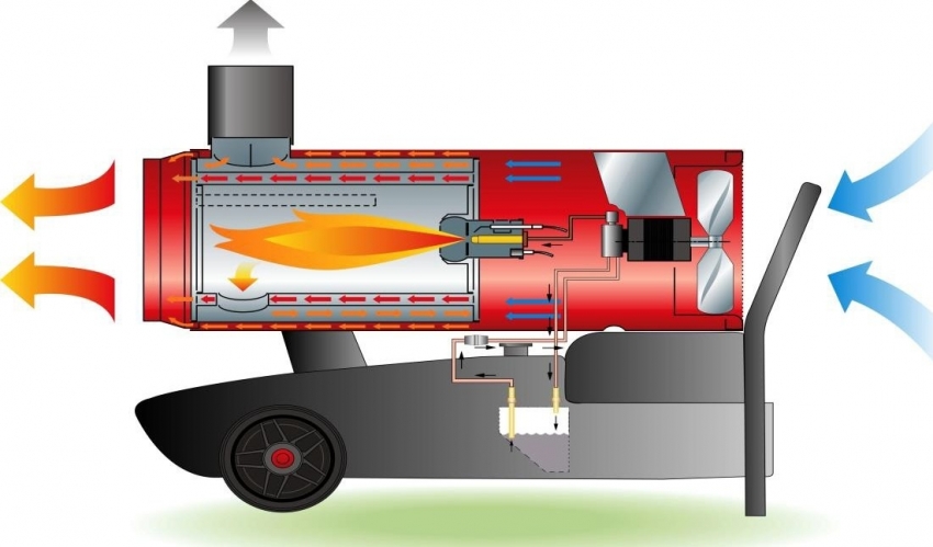 Prinsippet for drift av en varmepistol med indirekte oppvarming er at luften som blåses av viften passerer gjennom forbrenningskammeret og kommer inn i rommet som allerede er oppvarmet, og avfallsproduktene fra diesel fjernes fra rommet gjennom skorsteinen
