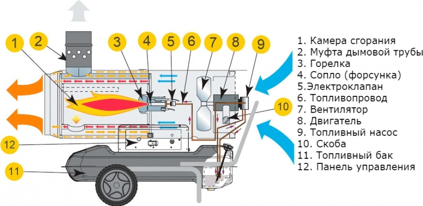 Varmepistolen er en universell enhet for romoppvarming. Prinsippet for drift av slike strukturer er ganske enkelt: en dieselmotor brenner ut inne i varmeren, som et resultat av at det genereres varme som tilføres rommet med en kraftig vifte.
