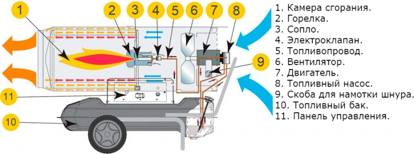 En dyse er installert i konstruksjonen av et lukket forbrenningskammer. I tillegg har kanonen et system designet for å fjerne forbrenningsprodukter. Luften som blåses av viften kommer ikke i kontakt med fakkelen. Oppvarmingen tilveiebringes ved å blåse forbrenningskammeret.