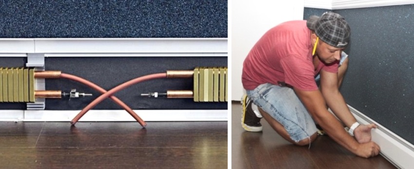 Installasjonen av et slikt varmeelement utføres ikke nær gulvflaten, men med et visst gap, ca 1 cm. I dette tilfellet bør avstanden fra veggen være ca. 15 mm for å gi konveksjon til enheten og forhindre overoppheting av enheten.