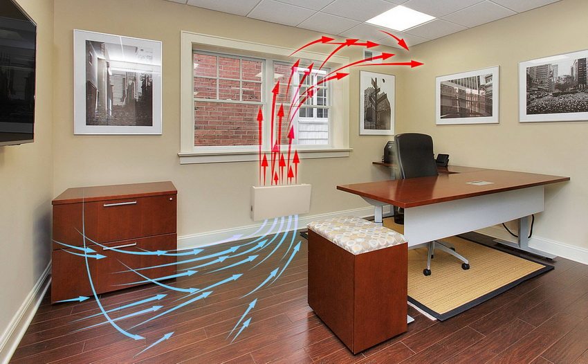 - Ujevn oppvarming av luft i forskjellige høyder - Når du bruker en konvektor, kan forskjellen i lufttemperatur på gulvet og i taket være opptil 9-10 ° C, siden den oppvarmede luften straks suser oppover, og den kalde luften forblir under.