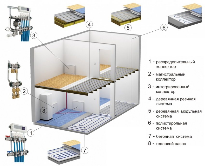 Type overlapping påvirker materialene og valget av lagtykkelser over og under røret. Gulvvarme er basert på sementdekk og gulvsystemer laget av polystyren eller tre-rør. Aluminiumsprofilen i skinnemodulene fungerer som isolasjon av tre fra direkte kontakt med varmeelementet og for å feste rør.