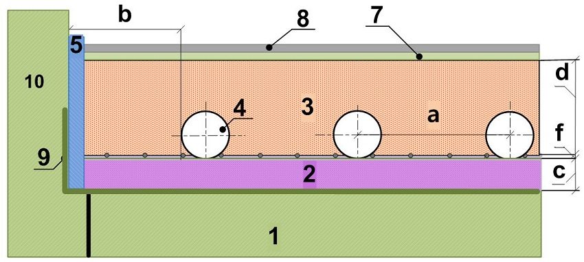 Overflaten som er rengjort og behandlet med en polymergrunning, blir jevnet på forhånd, vanntetting gjøres på jord og første etasje. Veggene er limt rundt omkretsen med et demperbånd til en høyde som vil gå under avstøpningen (med liten margin). Termisk isolasjonsmateriale med foliebase beskytter den spesifikke varmestrømmen oppover i en gitt retning. Varmetap gjennom folien overstiger ikke 5%.