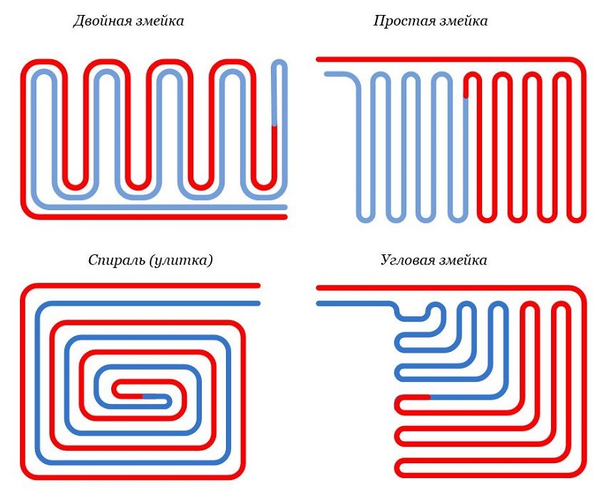 Alternativer for rørlegging: enkle, hjørne- eller dobbeltløkker (slanger), spiraler (snegler). For smale korridorer og rom med uregelmessig form brukes slangelegging. Store områder er delt inn i sektorer. Kombinert legging er tillatt: i randsonen legges røret med en slange, i hoveddelen - med en snegl.