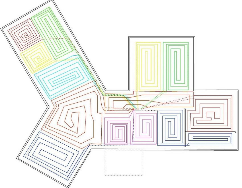 Med et stort område av rommet er varmekretsen delt inn i sektorer. De grunnleggende reguleringsreglene er sideforholdet 1/2, oppvarming av en sektor ikke mer enn 30 m² og med samme lengde og diameter for kjedene til en samler.
