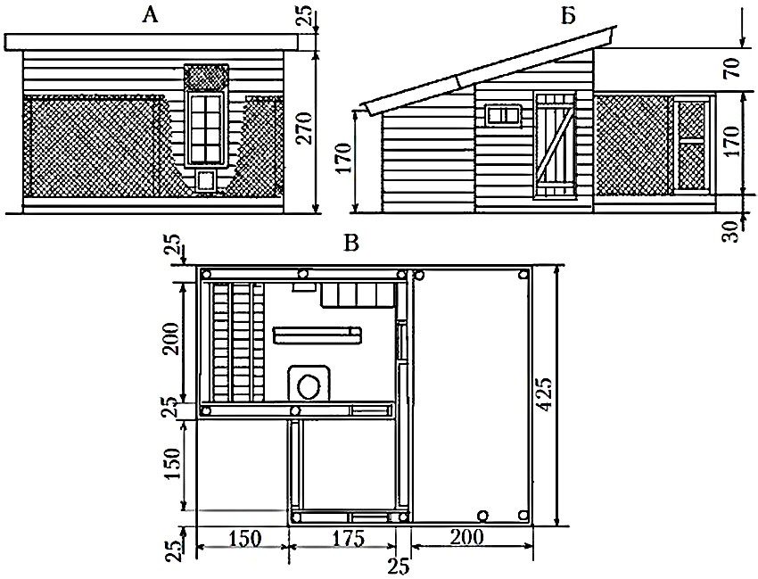 Coop for 10 kyllinger: A - fasade; B - utsikt fra siden av vestibylen; B - generell plan for kyllinghuset