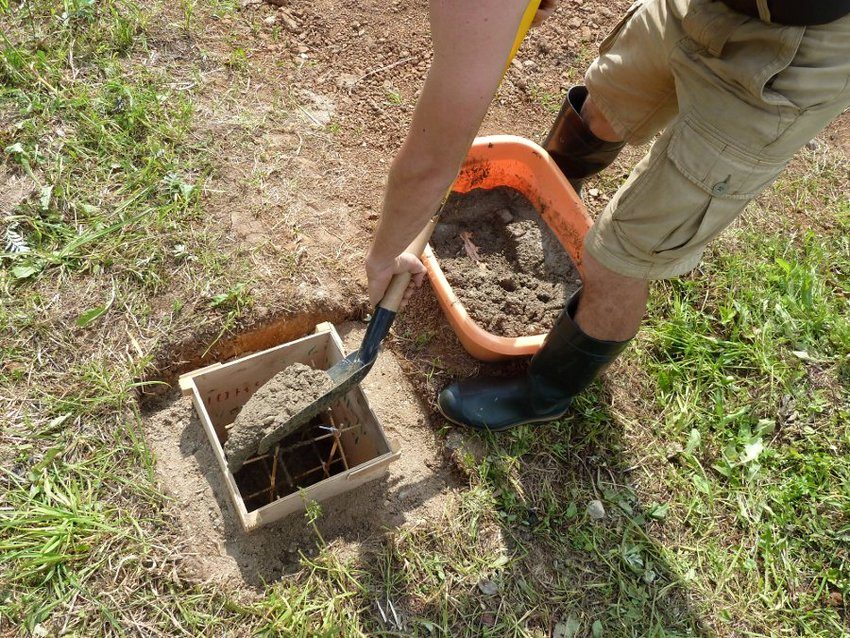 - Bor groper rundt omkretsen av det fremtidige kyllinghuset til en dybde på 1 m. Diameteren på hver skal være omtrent 15-20 cm. Avstanden mellom stolpene skal være 1 m.