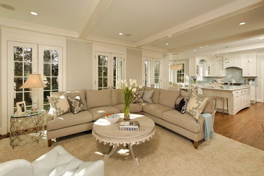 For å visuelt utvide rommet og skape en følelse av frihet, er det bedre å bruke et tak i ett nivå med innebygde sonespotter med justerbar lysstyrke. Dette vil gjøre det mulig å justere mengden lys i hver del av rommet (og også spare energi).