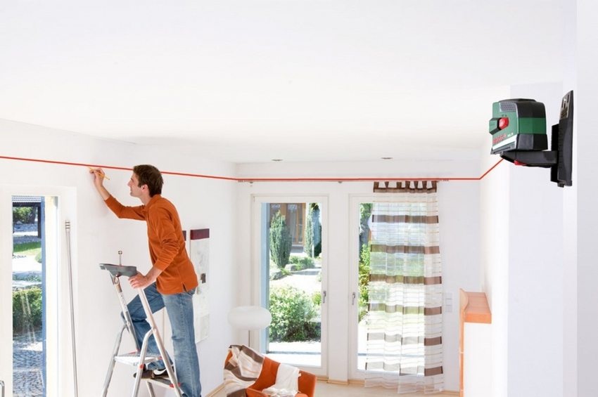 Høyde merke. Når du måler høyden på rommet med et målebånd, bør du finne den laveste vinkelen i den (på en vegg på 6 m lang er en konstruksjonsfeil på 1-1,5 cm i høyden tillatt, og når du installerer et undertak er hver centimeter kritisk). Deretter, fra gulvet (ikke fra taket!) Du må måle den nødvendige høyden slik at 10 cm blir igjen til taket. Bruk et vannstand langs hele veggen langs rommets omkrets, merk det horisontale og merk det med en malingsledning.