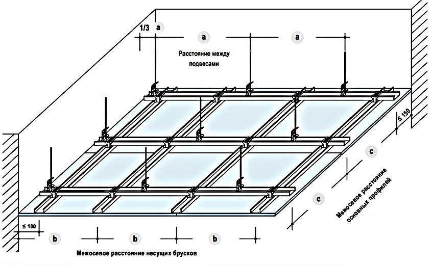 Deretter er taket merket med parallelle linjer og hengningene festes. Vanligvis er det nok å installere dem med et trinn på 50-70 cm. Hvis strukturen er kompleks og flerlags, installeres suspensjonene ikke en etter en, men parvis i en avstand på 5-10 cm fra hverandre.