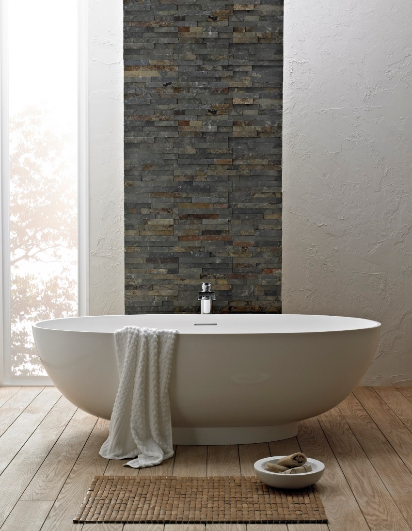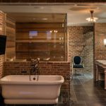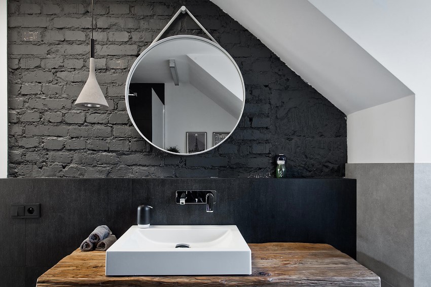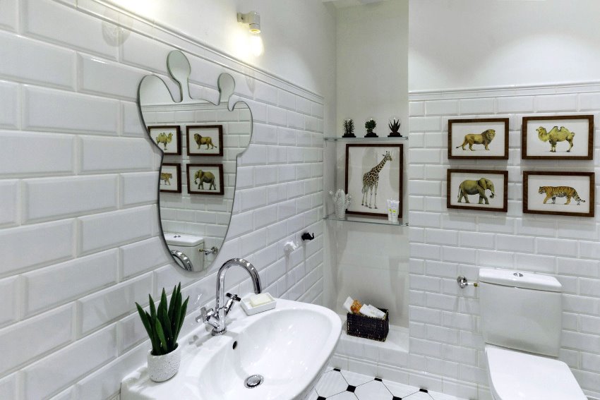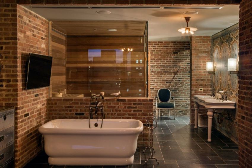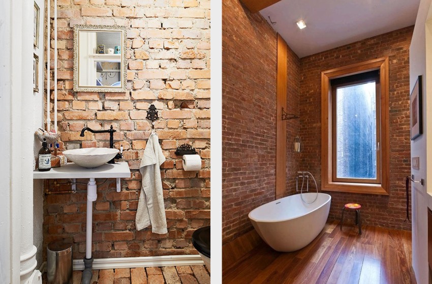 Fuktbestandig murstein brukes med hell til veggdekorasjon på badet. Det passer perfekt inn i interiøret og tåler driftsforholdene i rommet. Murverket kan være ekte eller etterligning. Bruk av glassblokker er tillatt. De er holdbare, derfor passer de ikke bare til veggdekorasjon, men også til gulv. Dette materialet lar deg ta med oppvarming og til og med installere en spektakulær bakgrunnsbelysning.