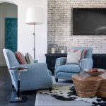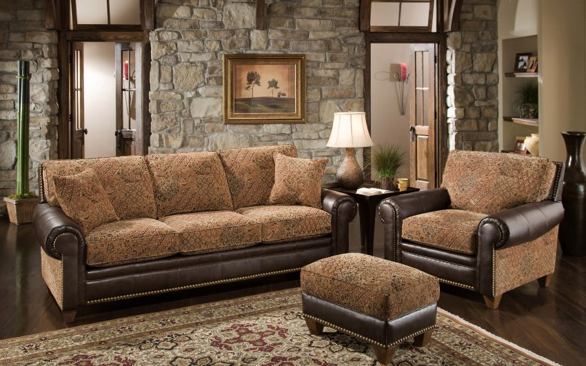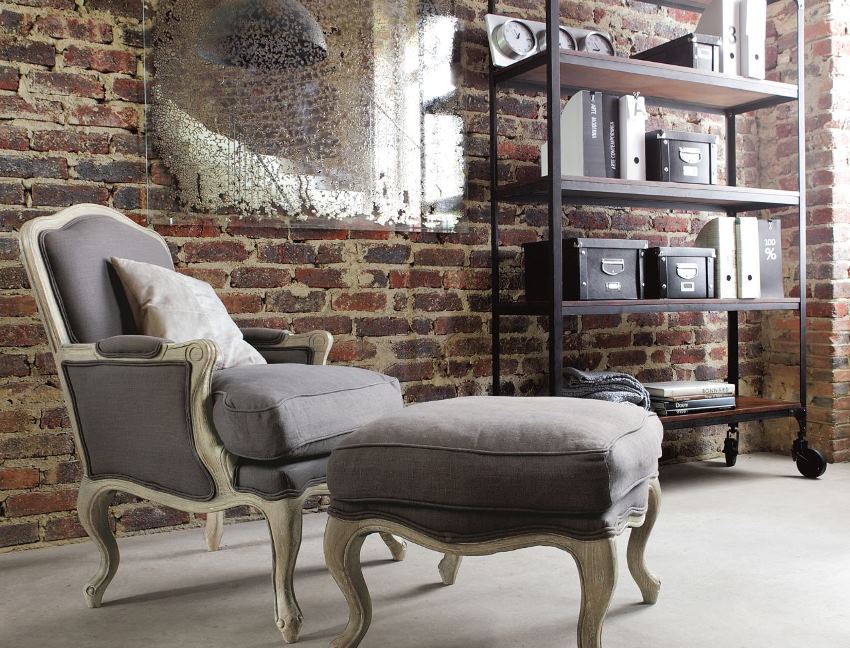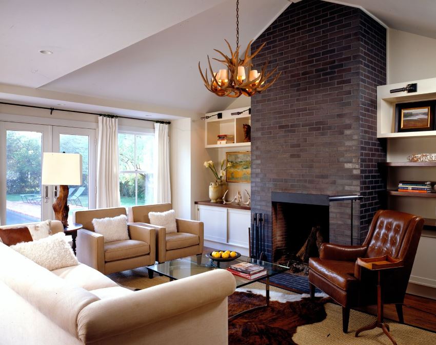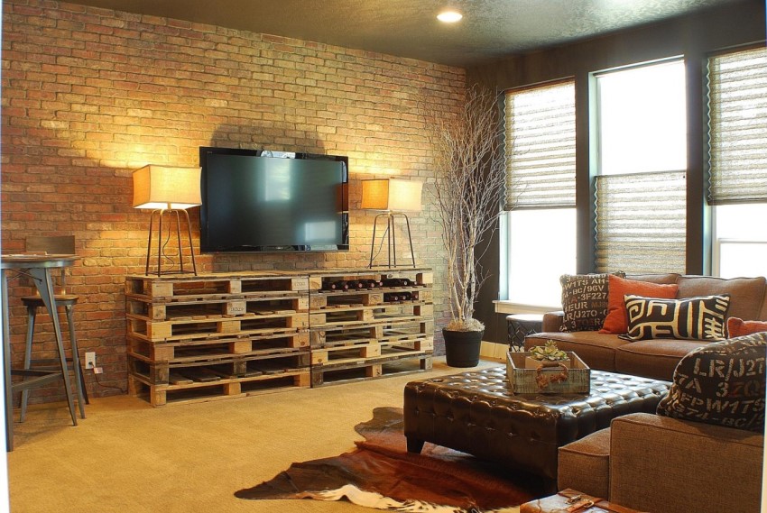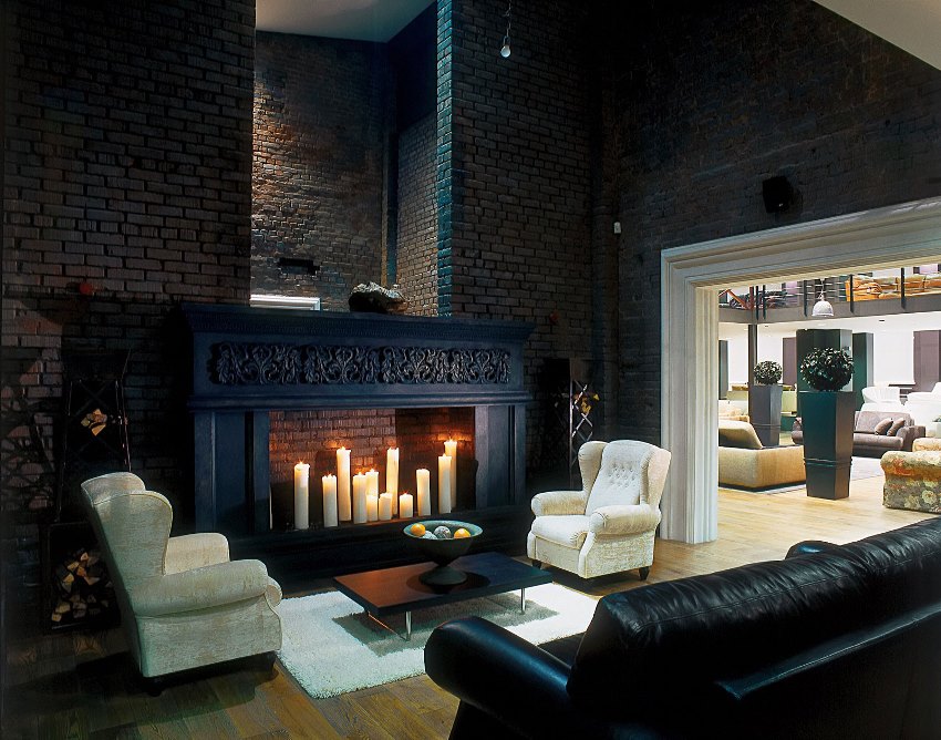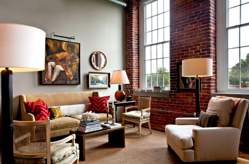 Hvis en delvis overflatebehandling er nødvendig, dekkes et lite område av overflaten med murstein. Denne metoden lar deg understreke soliditeten til veggene i stuen.