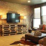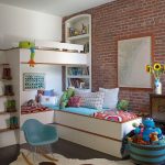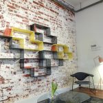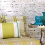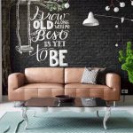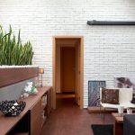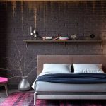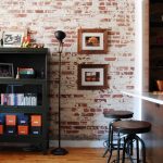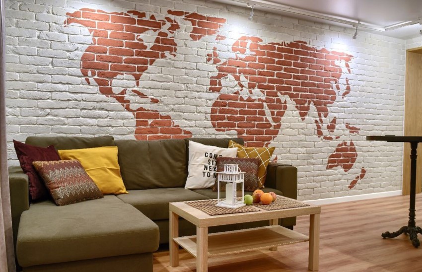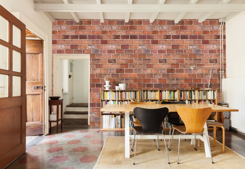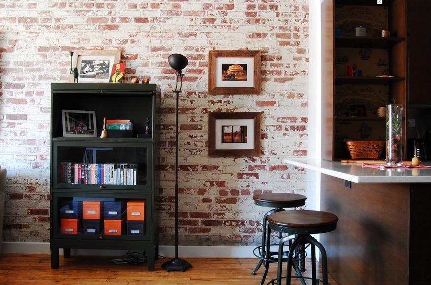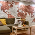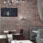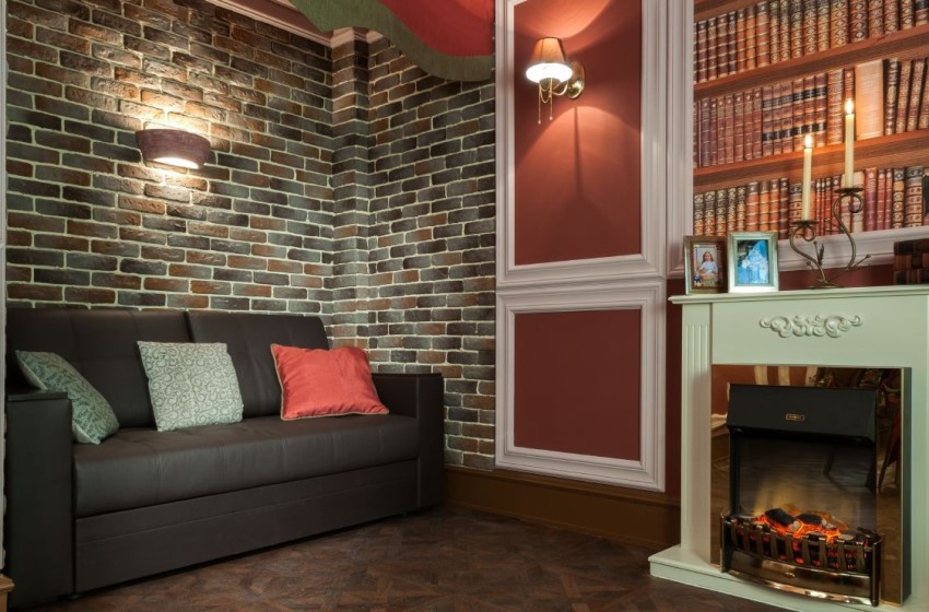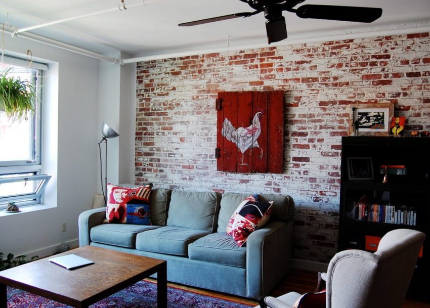 Etterligning av en murvegg: bilde av interiør ved bruk av tapet