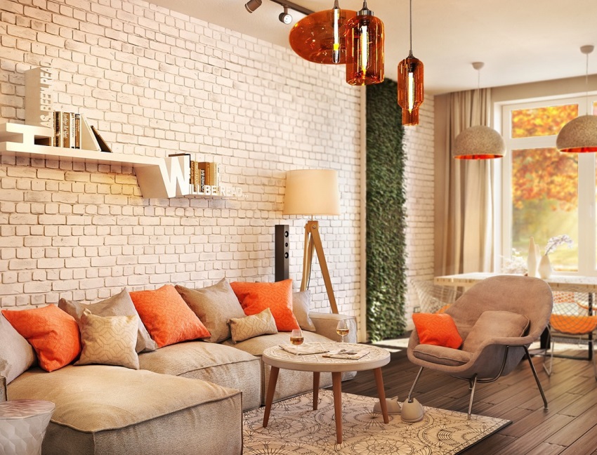Standard skyggen av murvegger er rødbrun. Men dette betyr ikke at det indre av rommet bare kan begrenses av denne fargen. Når du velger et design, bør du ta hensyn til stilen og formålet med rommet.