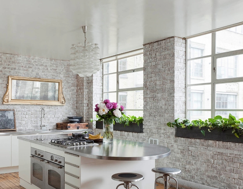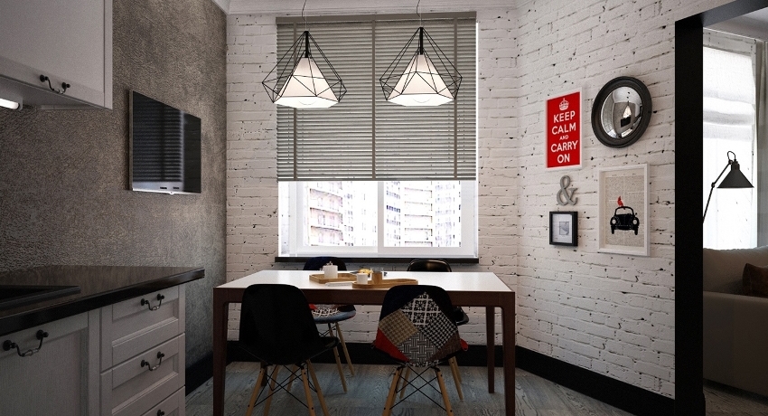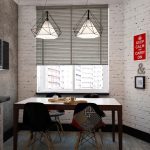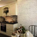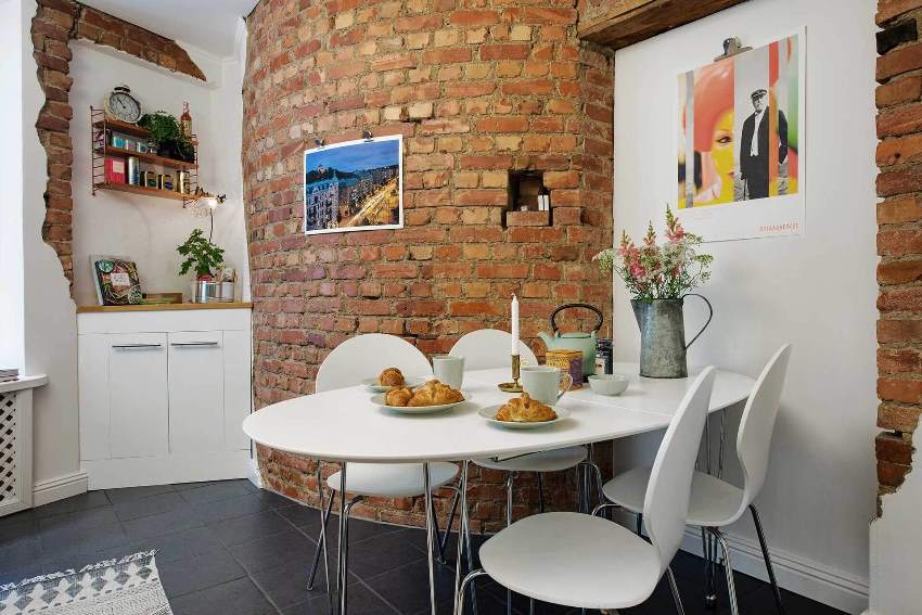 Kjøkkendesign er nesten ubegrenset. Mursteinen i det indre av dette rommet vil opprinnelig understreke utseendet til det eksisterende utstyret. Ved hjelp av dekorative murstein kan du sonere plassen og markere området der spisebordet skal stå.