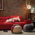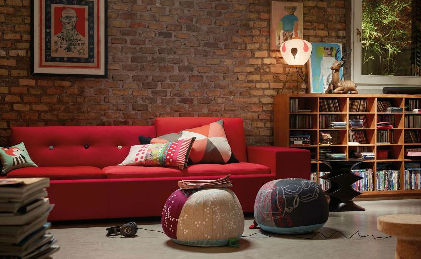 Merk! Du bør nøye velge møbler for et rom med en rød murvegg. Enkelte møbler kan falme eller rett og slett gå seg vill mot bakgrunnen, så det anbefales å unngå enkle former og nyanser som er nær tone.