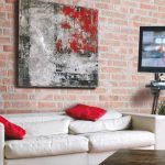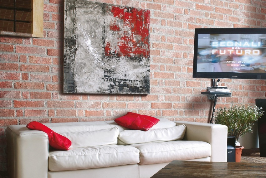 Rødt murverk fanger øyeblikkelig blikket og vekker oppmerksomhet. Selve veggen kan brukes som det viktigste dekorative elementet i det indre av rommet, slik at det ikke trenger ekstra dekorasjoner.