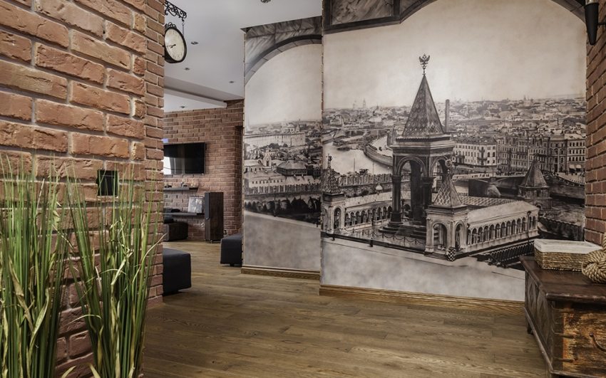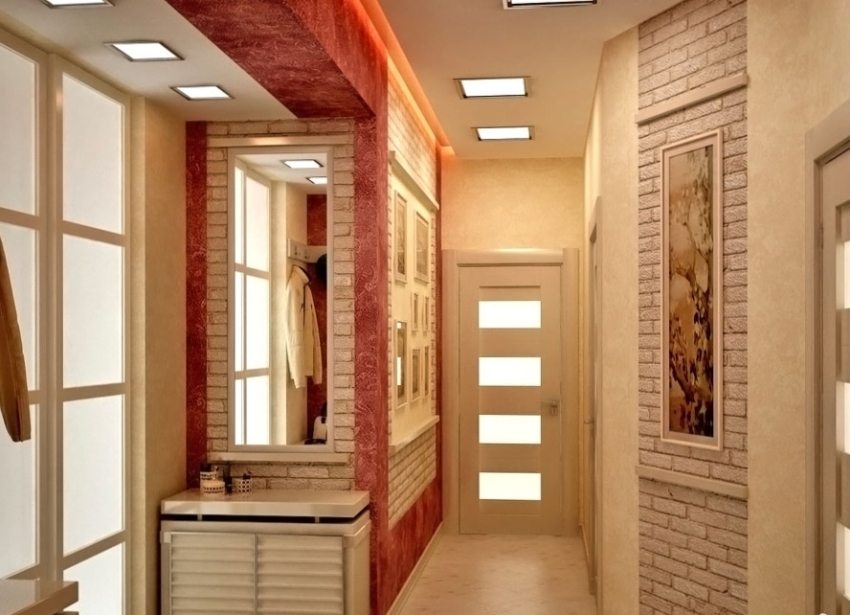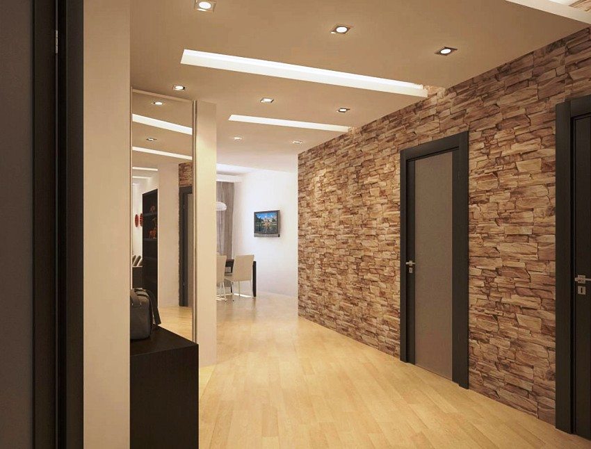 Dekorere gangen med dekorativ stein og tapet. Bilder av ferdig interiør