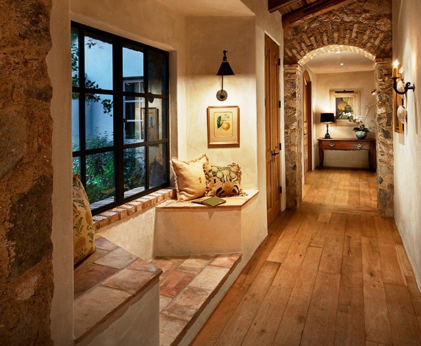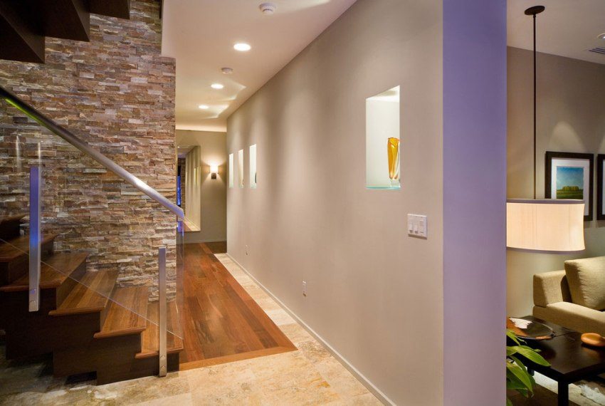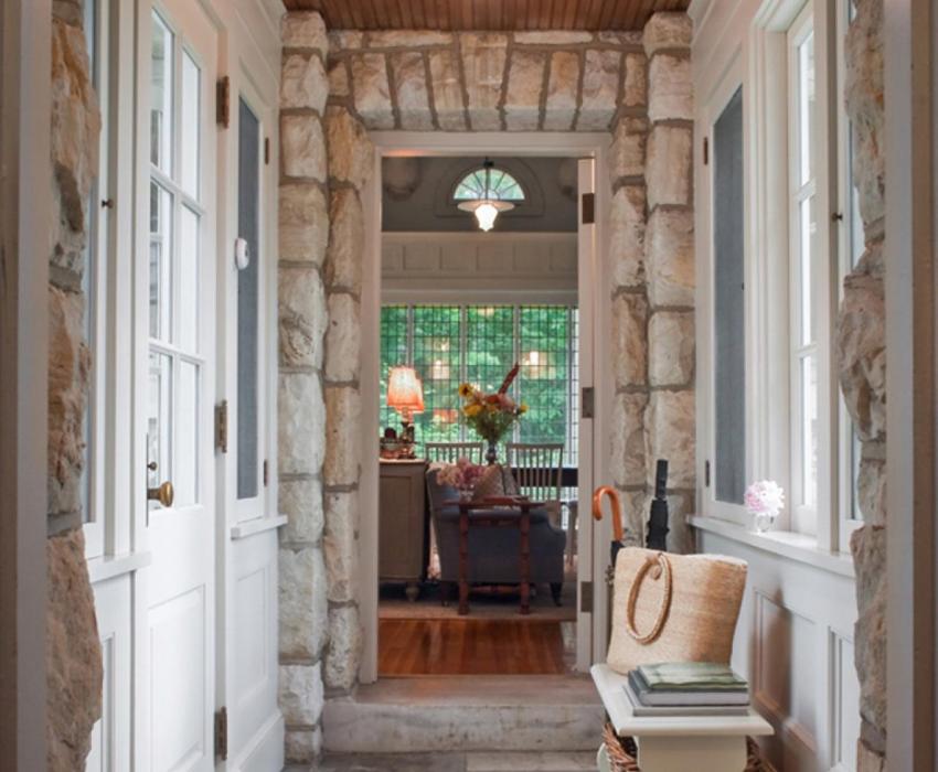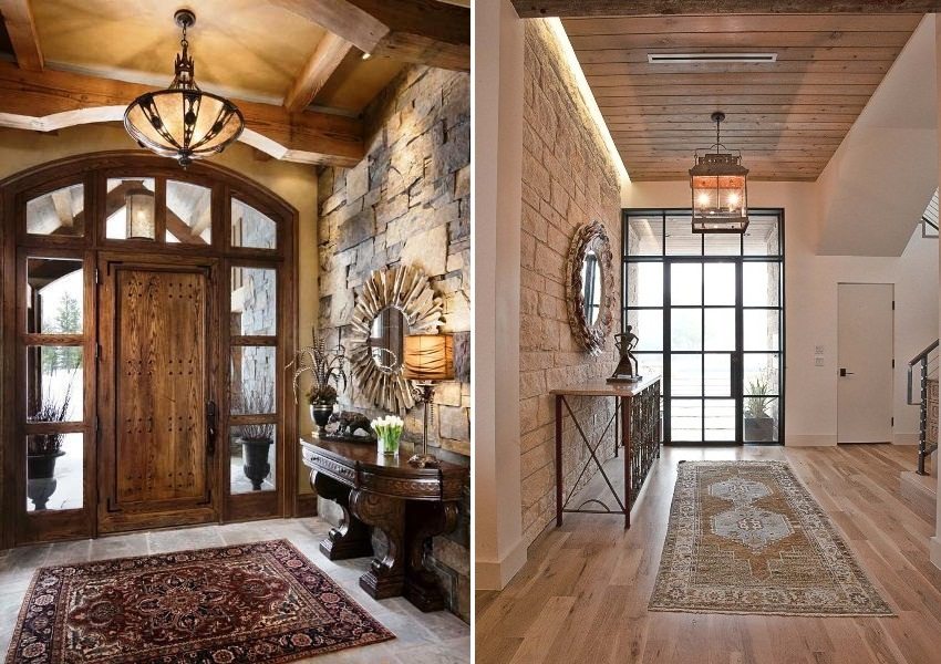 Bruk av stein i det indre av gangene bidrar til å skape en behagelig, varm atmosfære av komfort og sikkerhet når du kommer inn i rommet. Når du dekorerer de fremre på denne måten, er det viktigste ikke å overdrive det. Massive vegger, helt laget av stein, vil ikke se ut i et lite rom, men vil skille seg ut i store lobbyer. Fragmentert etterbehandling brukes vanligvis i leiligheter. Vindus- og døråpninger, synlige hjørner eller den sentrale delen av veggen, dekorert med etterligning av stein, ser flott ut. Et interessant dekorativt element er et speil innrammet med steinfliser.