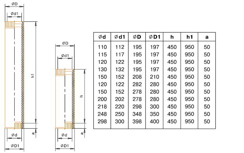 Dans la documentation technique, les fabricants indiquent deux valeurs pour le diamètre d'un tuyau sandwich pour une cheminée. Le premier est la section du tuyau intérieur, le second est le diamètre du tuyau extérieur. Les dimensions des tuyaux sandwich pour la cheminée sont choisies en fonction de la combinaison avec quel équipement ils seront utilisés. Moins le chauffe-eau est puissant, plus la section transversale requise pour le conduit de fumée est petite.