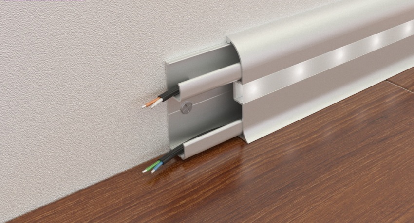 Najpierw musisz naprawić listwy przypodłogowe. Jeśli puste przestrzenie tych elementów są używane jako kanał do okablowania, należy je wskazać na schemacie przed rozpoczęciem bezpośredniej pracy. W drugim etapie wymagane jest ułożenie skrzynek od listew przypodłogowych do urządzeń elektrycznych (gniazdka, przełączniki). Następnie przeciągane są przez nie kable.